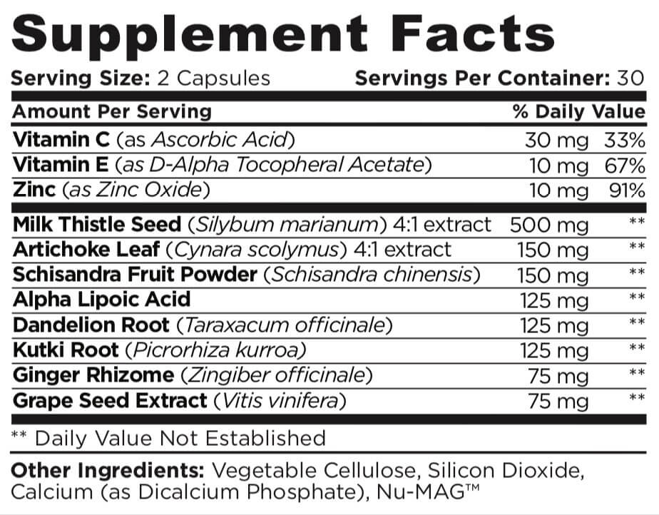 Globe artichoke extract, dandelion root, milk thistle and N-Acetyl-Cysteine are among this formula’s 11 liver supporting extracts and amino acids.
