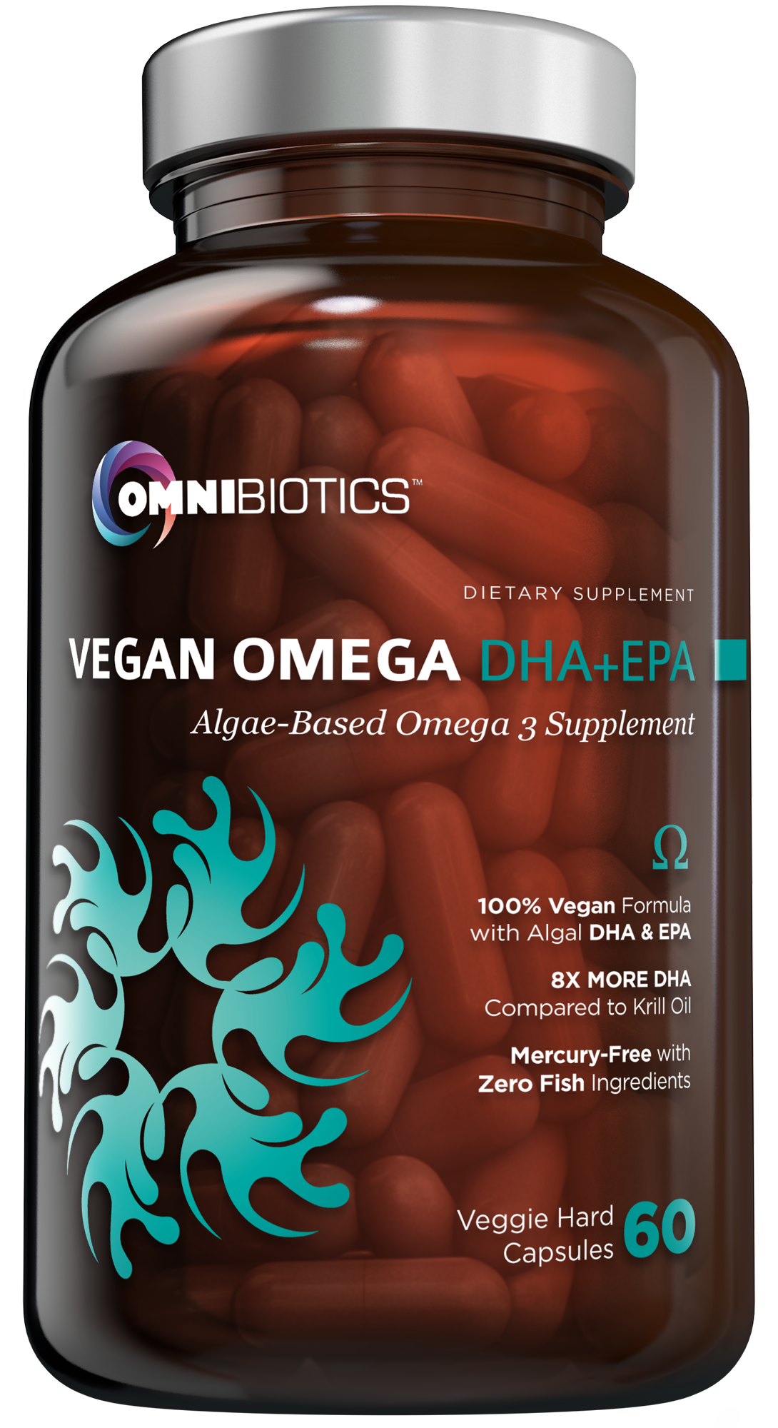 OmniBiotics Vegan Omega 3 DHA+EPA graphic featuring algae-based omega-3 bottle (60 veggie softgels).